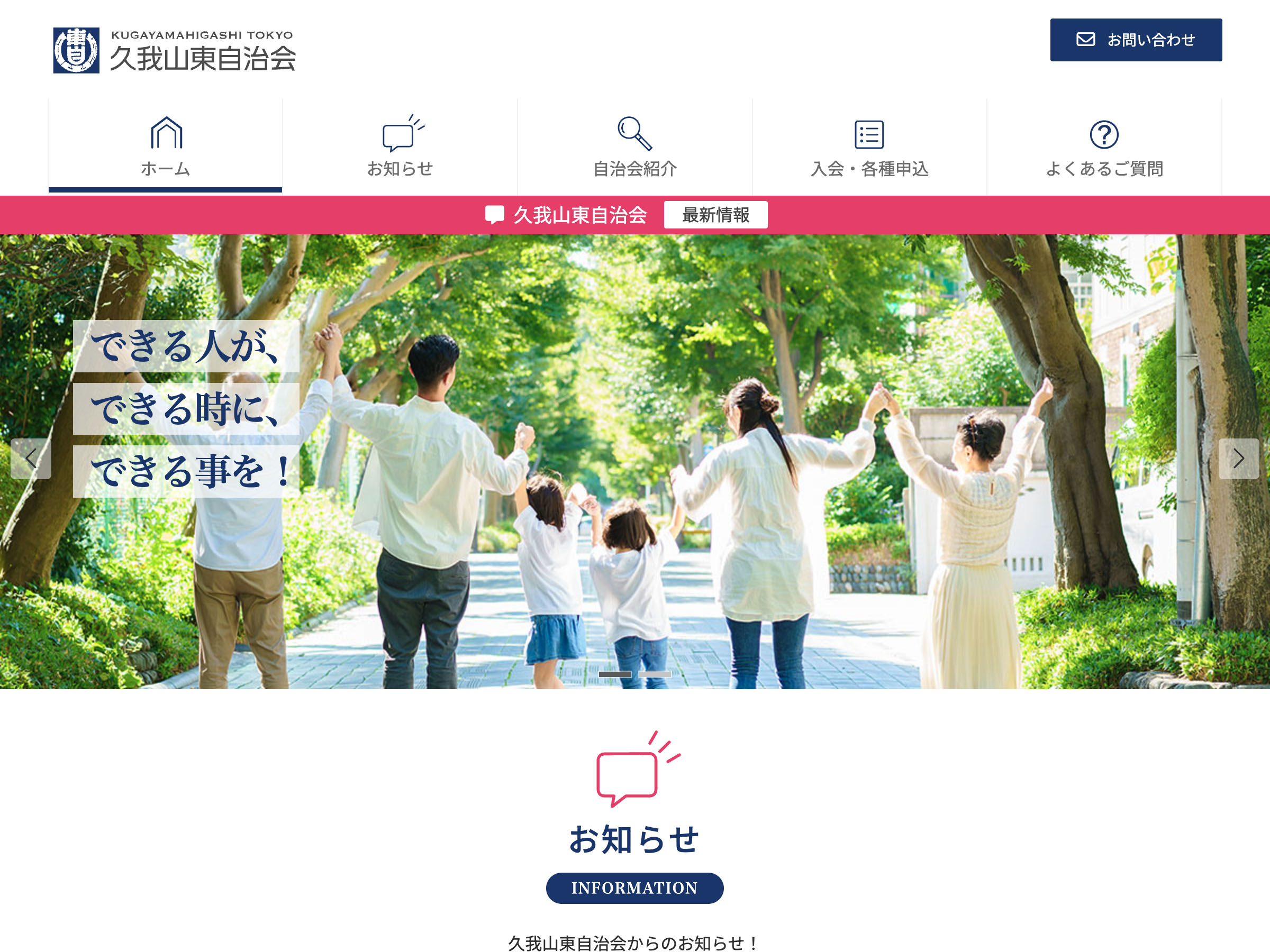 「自治会紹介」のほか、「入会・各種申込」などもホームページのフォームから行えるようにしています。「お知らせ」では、「広報」「回覧板」「資源集団回収」「イベント情報」「防犯・防災」などカテゴリー毎に掲載して閲覧者が目的の情報にアクセスしやすくなるように工夫しています。地域や自治会の活動を紹介する「お知らせ」は自治会のホームページご担当者様が随時最新情報の追加および更新が可能な形で制作しています。